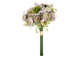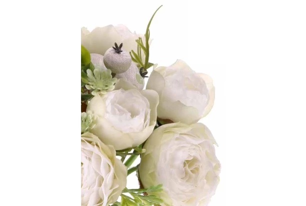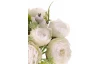Krásne aranžovaná umelá kytica imituje iskerníkov v bielej farbe. Iskerníky čiže ranunkulusy v pugete vyzerajú elegantne a ozdobia každý domov.