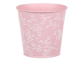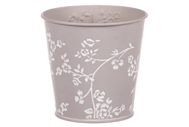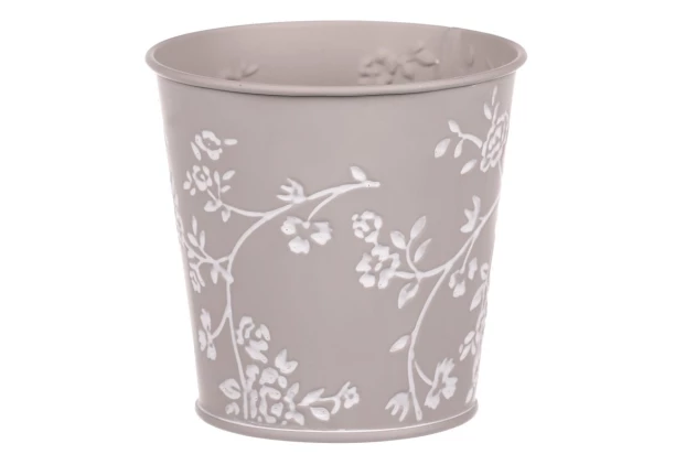 Dekoratívny kovový obal na kvetináč v šedej farbe s bielymi ružičkami, doladí každý interiér. Nielen praktický doplnok, ale aj pekná dekorácia na kvety. Priemer 11 cm.