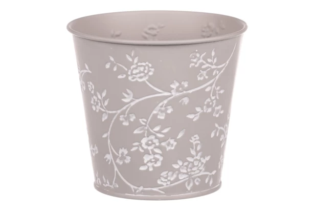 Dekoratívny kovový obal na kvetináč v šedej farbe s bielymi ružičkami,ladí každý interiér. Nielen praktický doplnok, ale aj pekná dekorácia na kvety. Priemer 14 cm.