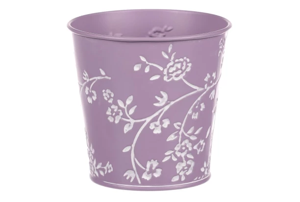 Dekoratívny kovový obal na kvetináč vo fialovej farbe s bielymi ružičkami doladí každý interiér. Nielen praktický doplnok, ale aj pekná dekorácia na kvety. Priemer 11 cm.
