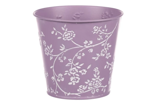 Dekoratívny kovový obal na kvetináč vo fialovej farbe s bielymi ružičkami doladí každý interiér. Nielen praktický doplnok, ale aj pekná dekorácia na kvety. Priemer 14 cm.