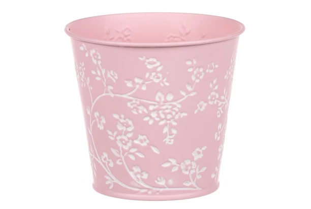 Dekoratívny kovový obal na kvetináč v ružovej farbe s bielymi ružičkami doladí každý interiér. Nielen praktický doplnok, ale aj pekná dekorácia na kvety. Priemer 14 cm.