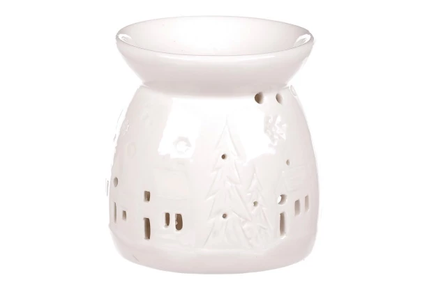 Elegantná aróma lampa na čajovú sviečku a vonné vosky s vianočným motívom dediny v bielej farbe prevonia interiér a doplní sviatočnú výzdobu
