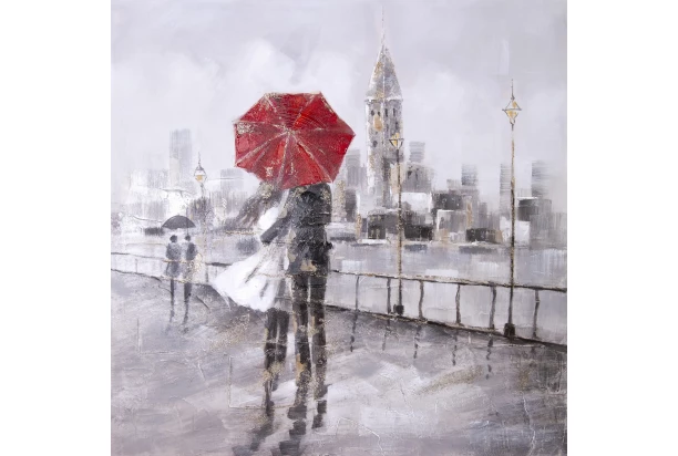 Ručne maľovaný obraz na stenu s 3D štruktúrou povrchu sa stane jedinečnou dekoráciou vašej domácnosti. Umelecký originál s motívom zamilovaného páru pod červeným dáždnikom zútulnia a rozžiaria každý interiér. Rozmer 80×80 cm..