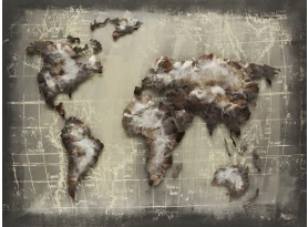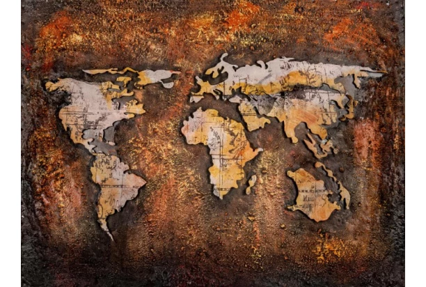 Nádherne prepracovaný ručne vyrobený kovový obraz na stenu vo vintage optike, vystupuje do priestoru a vytvára tak jedinečný 3D efekt. Umelecký obraz s motívom mapy sveta sa stane netradičnou dekoráciou vo Vašom interiéri. Rozmer 80×60 cm.
