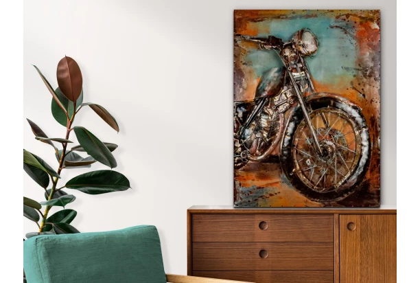 Nádherne prepracovaný ručne vyrobený kovový obraz na stenu vo vintage optike, vystupuje do priestoru a vytvára tak jedinečný 3D efekt. Umelecký obraz s retro motívom veteránskej motorky sa stane netradičnou dekoráciou vo Vašom interiéri. Rozmer 60×80 cm.