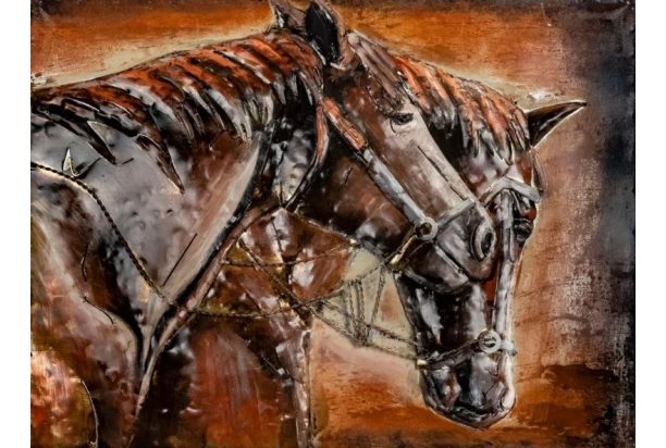Nádherne prepracovaný ručne vyrobený kovový obraz na stenu vo vintage optike, vystupuje do priestoru a vytvára tak jedinečný 3D efekt. Umelecký retro obraz s motívom koní sa stane netradičnou dekoráciou vo Vašom interiéri. Rozmer 80×60 cm.