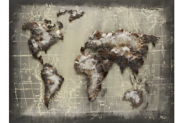 Nádherne prepracovaný ručne vyrobený kovový obraz na stenu vo vintage optike, vystupuje do priestoru a vytvára tak jedinečný 3D efekt. Umelecký retro obraz s motívom mapy sveta v šedej farbe sa stane netradičnou dekoráciou vo Vašom interiéri. Rozmer 80×60 cm.