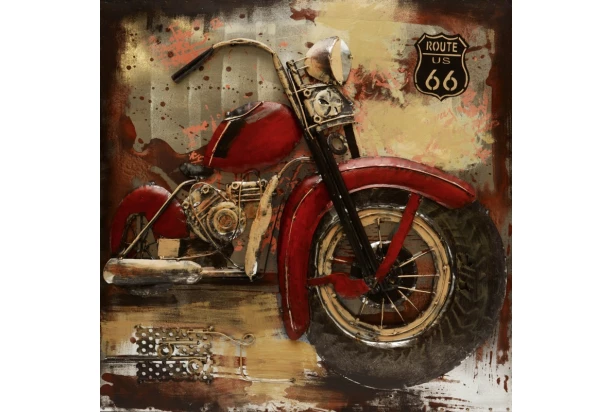 Nádherne prepracovaný ručne vyrobený kovový obraz na stenu vo vintage optike ,vystupuje do priestoru a vytvára tak jedinečný 3D efekt. Umelecký retro obraz s plastickým motívom červenej motorky a Route US 66 sa stane netradičnou dekoráciou vo Vašom interiéri. Rozmer 80×80 cm.