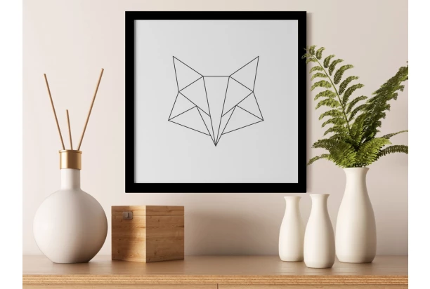 Obraz v drevenom čiernom ráme zaujme modernou grafikou v Nordic štýle. Jednoduchý čierny geometrický obrazec hlavy líšky na bielom pozadí dokonale doplní akýkoľvek interiér s minimalistickým charakterom. Kombinácia s ďalšími obrazmi škandinávskeho štýlu vytvorí na stene originálnu koláž. Rozmer 30×30 cm.