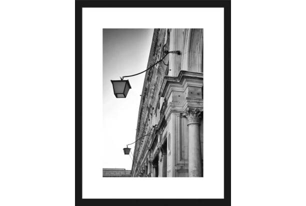 Zarámovaný obraz v drevenom čiernom ráme s motívom lámp na budove je vyrobený technikou fototlače. Jednoduché, ale elegantné čiernobiele prevedenie obrazu dodá Vášmu interiéru výnimočnú atmosféru. Rozmer 30×40 cm.