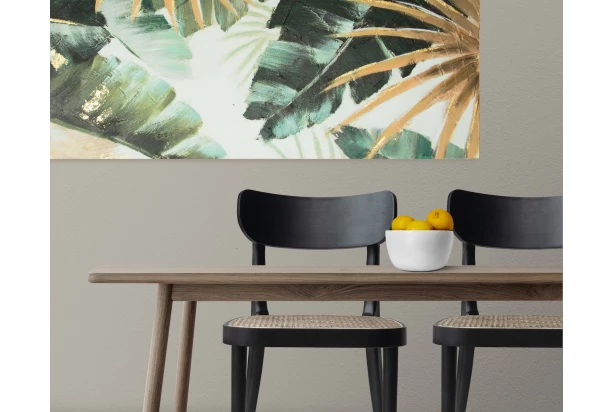 Ručne maľovaný obraz na stenu s výraznou štruktúrou povrchu sa stane jedinečnou dekoráciou vašej domácnosti. Umelecký originál maľovaný akrylovými farbami s prírodným motívom tropických listov v modernom spracovaní, zútulní a rozžiari každý interiér. Rozmer 120×40 cm.