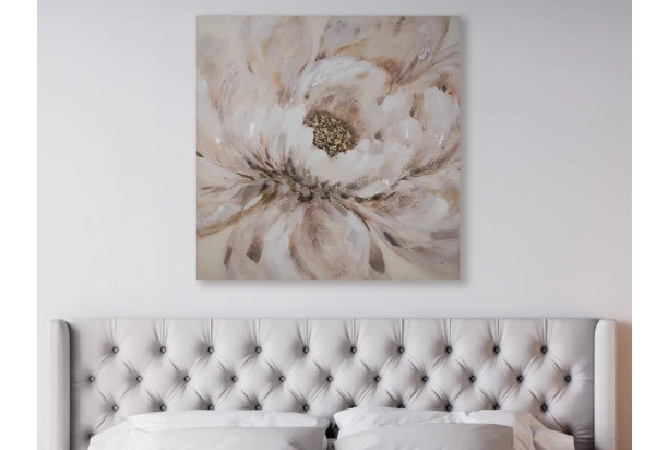 Ručne maľovaný obraz na stenu s výraznou štruktúrou povrchu sa stane jedinečnou dekoráciou vo vašej domácnosti. Umelecký originál s prírodným kvetinovým motívom, príjemne zútulni a oživí každý interiér. Rozmer 100×100 cm.