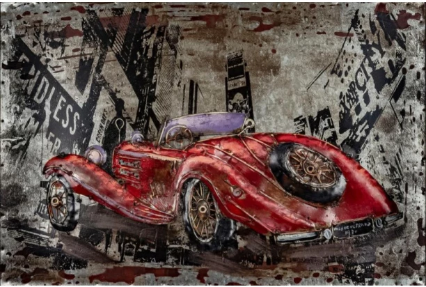 Ručne vyrobený obraz na stenu vo vintage optike na kovovom podklade vytvára jedinečný 3D efekt. Umelecký obraz s motívom veteránskeho červeného vozidla sa stane netradičnou dekoráciou vo Vašom interiéri. Rozmer 60×40 cm.