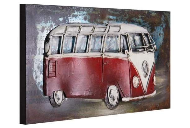 Ručne vyrobený obraz na stenu vo vintage optike na kovovom podklade vytvára jedinečný 3D efekt. Umelecký obraz s motívom veteránskeho vozidla Volkswagen sa stane netradičnou dekoráciou vo Vašom interiéri. Rozmer 80×40 cm.