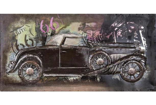 Ručne vyrobený obraz na stenu vo vintage optike na kovovom podklade vystupuje do priestoru a vytvára tak jedinečný 3D efekt. Umelecký obraz s motívom veteránskeho vozidla sa stane netradičnou dekoráciou vo Vašom interiéri. Rozmer 80×40 cm.