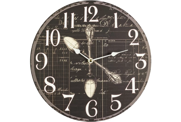 Nástenné drevené hodiny v štýlovom vintage prevedení s motívom lyžičiek a nápisov perfektne dotvoria celkový dojem každej kuchyne. Priemer 30 cm.