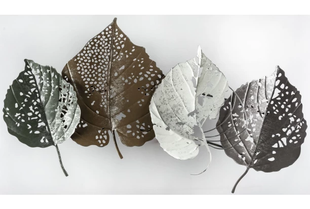 Kovová nástenná dekorácia s úžasnou kompozíciou vzájomne sa prekrývajúcich listov, Vás nadchne nad pohovkou alebo posteľou. Vkusná a estetická 3D ozdoba s ručnou povrchovou úpravou sa rýchlo stane stredobodom pozornosti vo Vašom interiéri. Svojím farebným a originálnym dizajnom, dokonale zapadne do moderného štýlu bývania, do ktorého vnesie útulnosť a osobitý šmrnc. Rozmer 90×50 cm.