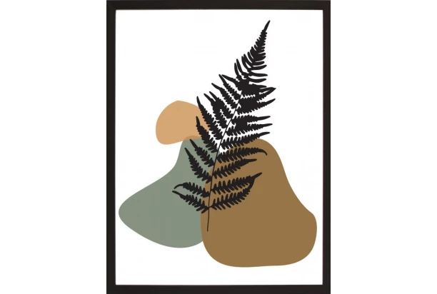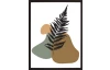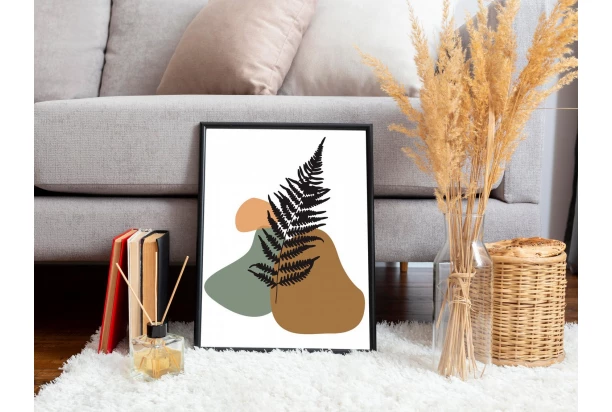 Obraz v drevenom čiernom ráme s nádychom škandinávskeho a boho štýlu v podobe minimalistickej modernej maľby s botanickým listom a abstraktnými tvarmi evokuje pocit pohodlia a umožní Vám vytvoriť útulný domov. Nástenná umelecká dekorácia v príjemných farbách sa skvele hodí ako doplnok do obývacej izby, spálne alebo domácej pracovne. Rozmer 30×40 cm.