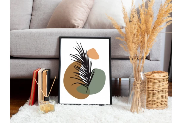 Obraz v drevenom čiernom ráme s nádychom škandinávskeho a boho štýlu v podobe minimalistickej modernej maľby s botanickým listom a abstraktnými tvarmi evokuje pocit pohodlia a umožní Vám vytvoriť útulný domov. Nástenná umelecká dekorácia v príjemných farbách sa skvele hodí ako doplnok do obývacej izby, spálne alebo domácej pracovne. Rozmer 30×40 cm.