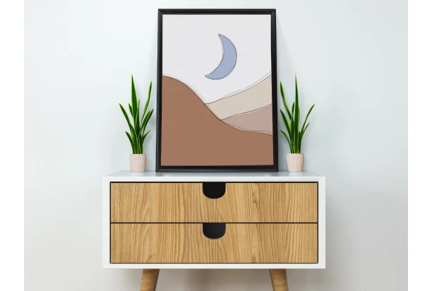 Obraz v drevenom čiernom ráme s nádychom škandinávskeho a boho štýlu v podobe minimalistickej modernej maľby s motívom krajiny a mesiaca evokuje pocit pohody a umožní Vám vytvoriť útulný domov. Nástenná umelecká dekorácia v príjemných farbách sa skvele hodí ako doplnok do obývacej izby, spálne alebo domácej pracovne. Rozmer 40×50 cm.