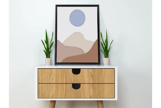 Obraz v drevenom čiernom ráme s nádychom škandinávskeho a boho štýlu v podobe minimalistickej modernej maľby s motívom krajiny a mesiaca evokuje pocit pohody a umožní Vám vytvoriť útulný domov. Nástenná umelecká dekorácia v príjemných farbách sa skvele hodí ako doplnok do obývacej izby, spálne alebo domácej pracovne. Rozmer 40×50 cm.