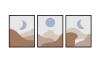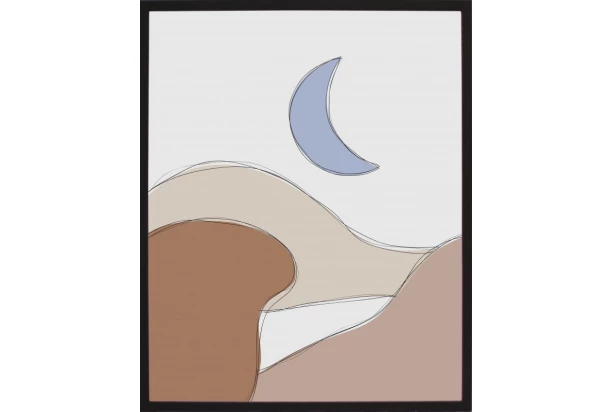 Obraz v drevenom čiernom ráme s nádychom škandinávskeho a boho štýlu v podobe minimalistickej modernej maľby s motívom krajiny a mesiaca evokuje pocit pohody a umožní Vám vytvoriť útulný domov. Nástenná umelecká dekorácia v príjemných farbách sa skvele hodí ako doplnok do obývacej izby, spálne alebo domácej pracovne. Rozmer 40×50 cm.