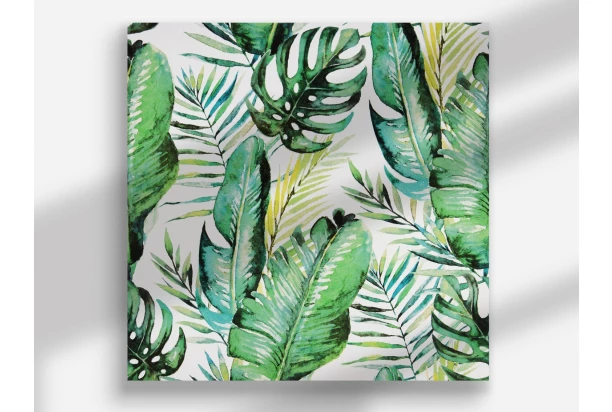 Obraz tlačený na plátne s motívom tropických listov príjemne oživí stenu v akejkoľvek miestnosti. Rozmer 40×40 cm.