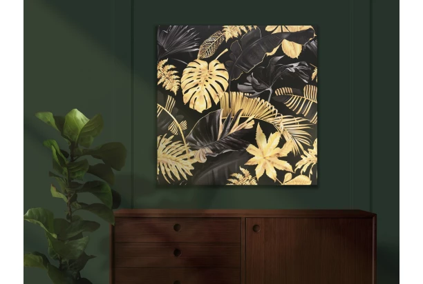 Obraz tlačený na plátne s pôsobivým motívom tropických listov v čiernej a zlatej farbe sa stane elegantnou dekoráciou na každej stene. Rozmer 80×80 cm.