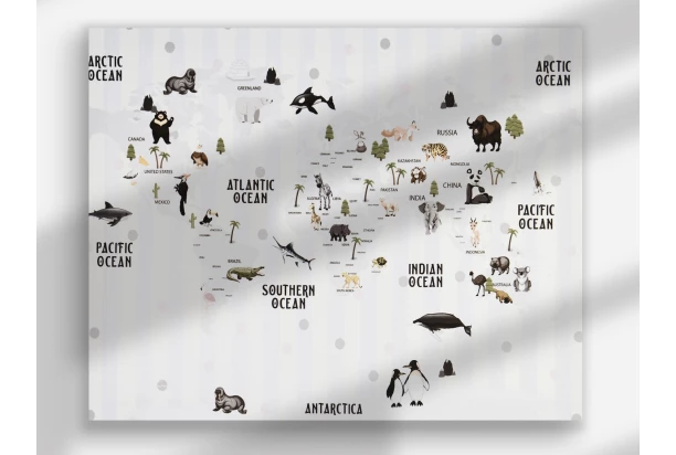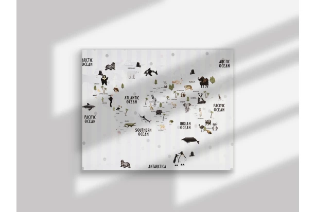 Obraz tlačený na plátne s motívom mapy sveta si obľúbia nielen deti, ale aj dospelí. Krásne ilustrovaná mapa Vám ukáže niekoľko druhov zvierat v mieste ich prirodzeného výskytu. Rozmer 40×50 cm.