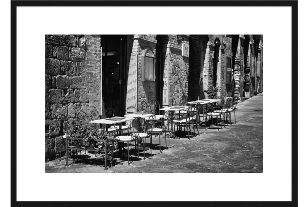 Zarámovaný obraz v drevenom čiernom ráme s motívom kaviarne je vyrobený technikou fototlače. Jednoduché, ale elegantné čiernobiele prevedenie obrazu dodá Vášmu interiéru výnimočnú atmosféru. Rozmer 70×50 cm.