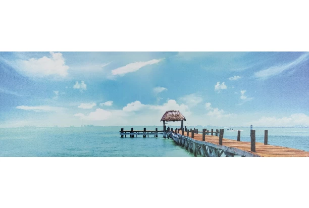 Obraz tlačený na plátne s letným motívom Tahiti dotvorí jedinečnú atmosféru domova. Drevené mólo pri mori vnesie do domácnosti upokojujúcu atmosféru. Rozmer 90×30 cm.