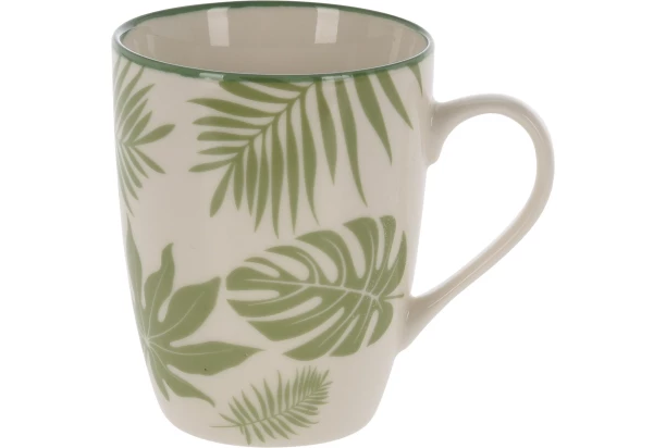 Hrnček s objemom 320 ml s motívom pôvabných zelených tropických listov sa hodí na podávanie studených aj teplých nápojov.