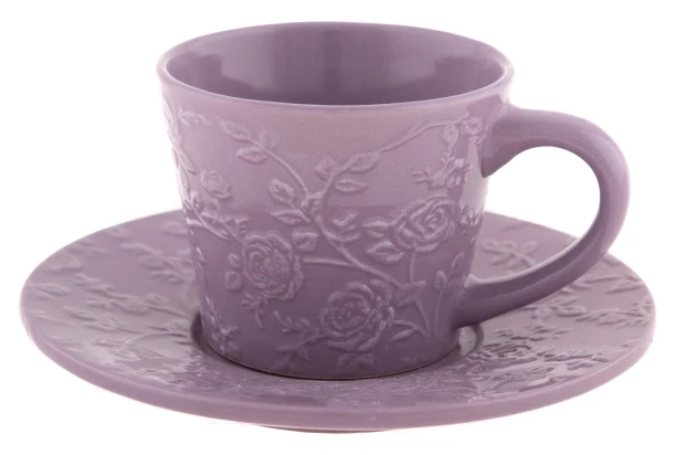 Elegantná keramická šálka s tanierikom v romantickom vzhľade dokonale ozvláštni posedenie s rodinou i priateľmi. Plastický kvetinový dekor vo fialovej farbe každého poteší a zaujme na prvý na pohľad. Vychutnajte si obľúbenú kávu alebo čaj v tejto keramickej šálke s objemom 180 ml..
