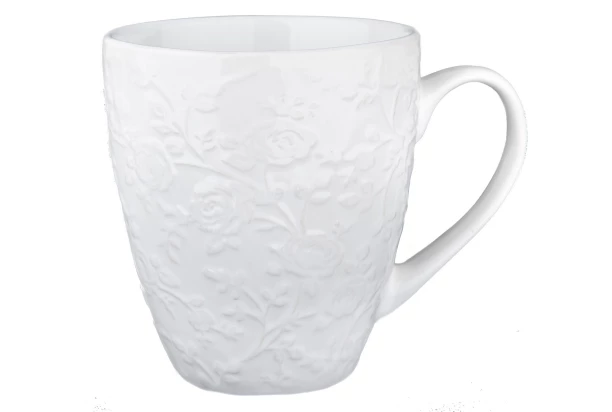 Elegantný keramický hrnček v romantickom vzhľade, dokonale ozvláštni posedenie s rodinou i priateľmi. Plastický kvetinový dekor v bielej farbe, každého poteší a zaujme na prvý na pohľad. Vychutnajte si obľúbenú kávu alebo čaj v tomto keramickom hrnčeku s objemom 530 ml.