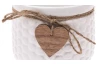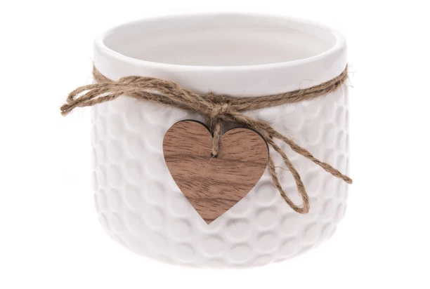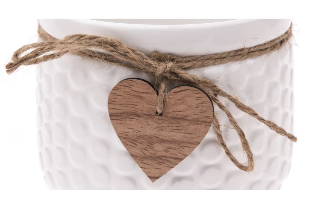 Obal na kvetináč s jutovým povrázkom a dreveným srdiečkom ,má plastický vzor a je vyrobený z keramiky v bielej lesklej farbe. Kvetináč ozdobí bylinky v kuchyni, kvitnúce rastliny v obývacej izbe, ale aj skvele poslúži ako dóza na ukladanie dekorácií a drobností. Jednoduchý romantický obal s výškou 9,5 cm zútulní Váš interiér a dovedie ho k úplnej dokonalosti.
