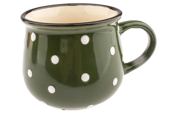 Keramický bucľatý zelený hrnček s bielymi bodkami ,poteší každého, kto miluje vidiecky štýl bývania. Chalupársky hrnček alebo tiež krajáč s objemom 230 ml je vhodný na studené či teplé nápoje, napríklad aj na mlieko.