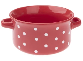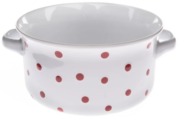 Keramická biela miska s ušami a červenými bodkami je ideálna na raňajky alebo desiatu. Praktický aj štýlový doplnok, ktorý skvele zapadne do kuchyne zariadenej vo vidieckom štýle, pričom sa tiež dokonale hodí na chalupu. Objem 560 ml.