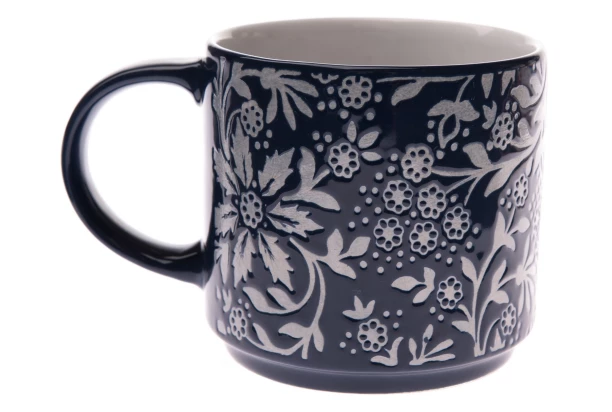 Keramický hrnček v tmavo modrej farbe s bielym kvetinovým vzorom je ideálny na každodenné pitie kávy alebo čaju. Objem 390 ml.
