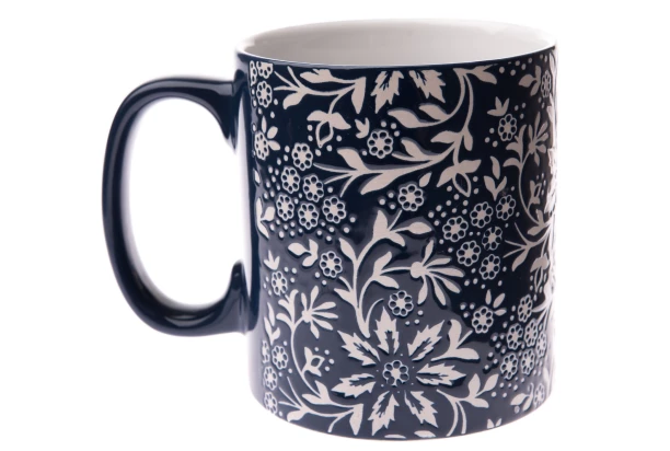 Keramický hrnček v tmavo modrej farbe s bielym kvetinovým vzorom je ideálny na každodenné pitie kávy alebo čaju. Objem 620 ml.
