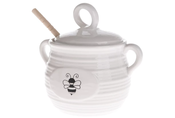 Praktická a elegantná biela dóza na med vo vidieckom štýle s motívom včely, má objem 450 ml a je vyrobená z keramiky. Štýlová nádoba na uchovávanie medu obsahuje špeciálnu drevenú lyžicu, s ktorou pohodlne namotáte a prenesiete med priamo na pokrm alebo do nápoja.