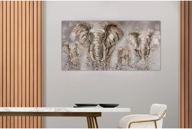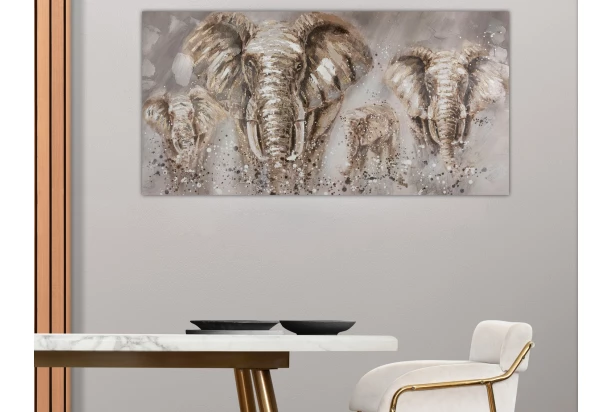 Ručne maľovaný obraz na stenu s moderným zvieracím motívom slonov rozžiari interiér a stane sa dokonalou dekoráciou na každej stene. Ideálne do domácnosti, kancelárie alebo ako forma originálneho daru. Rozmer 140×70 cm.