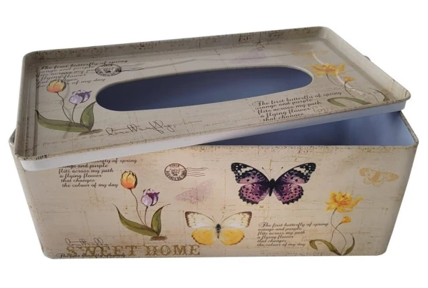 Atraktívny plechový box na papierové vreckovky, ktoré budete mať vždy po ruke. Motív kvetov a motýľov vykúzli v domácnosti príjemnú atmosféru.