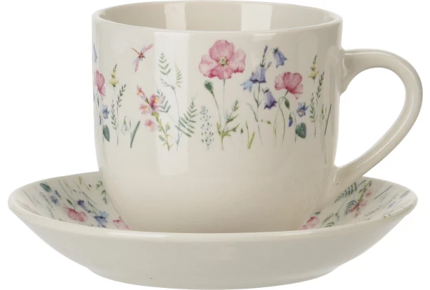 Elegantná šálka s jemným kvetinovým motívom rozkvitnutej lúky v pastelových farbách je dodávaná s tanierikom. Hrnček s výškou 7 cm, vnesie do Vášho domova kúsok prírody a hodí sa na podávanie teplej kávy pri všedných aj sviatočných príležitostiach.