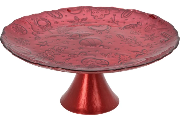 Servírovací sklenený podnos na tortu a cukrovinky s elegantným vianočným motívom v červenej farbe, dozdobí prestretý stôl a perfektne doladí sviatočnú atmosféru. Na tomto tanieri, tiež výborne vyzerá ovocie, klobásy, syry a ďalšie dobroty. Ideálne na Vianoce. Priemer 28 cm.