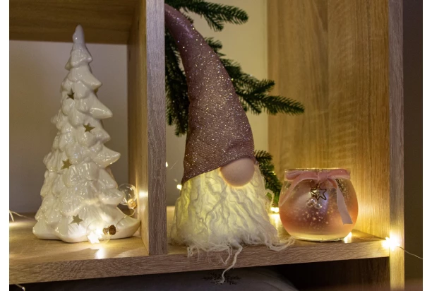 Vianočný škriatok s LED osvetlením, rozžiari Váš domov, do ktorého navyše vnesie kúzelnú atmosféru Vianoc. Posaďte trpaslíka ku krbu, na poličku, parapet alebo pod vianočný stromček a užite si tú správnu sviatočnú pohodu. Vianočná dekoratívna figúrka s výškou 30 je dodávaná s ružovou alebo šedou čiapočkou.
