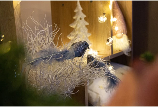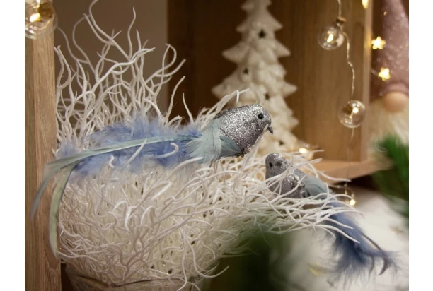 2 strieborno-modré vtáčiky s trblietavým telíčkom a chvostíkom z peria sa stanú originálnymi ozdobami Vášho vianočného stromčeka. Vďaka praktickému klipu je možné vianočné dekorácie ľahko kamkoľvek pripevniť a vytvoriť aj krásne vianočné aranžmány. Veľkosť 15 cm.