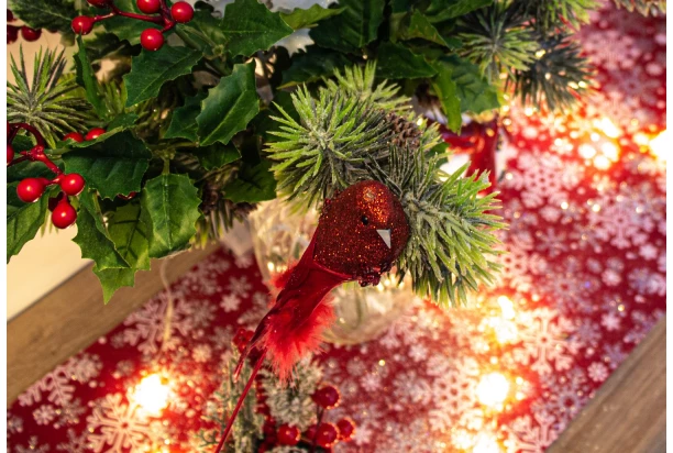 2 červené vtáčiky s trblietavým telíčkom a chvostíkom z peria sa stanú originálnymi ozdobami Vášho vianočného stromčeka. Vďaka praktickému klipu je možné vianočné dekorácie ľahko kamkoľvek pripevniť a vytvoriť aj krásne vianočné aranžmány. Šírka 15 cm.