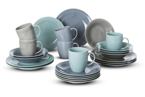 24-dielny jedálenský servis z kolekcie Jive, obsahuje všetko na každodenné použitie. Porcelánový riad v šedej, modrej a mentolovej farbe so vzorom prúžkov, sa stane ozdobou Vášho stola. Jedálenská sada s nadčasovým dizajnom je ideálna na raňajky, obed, večeru alebo k popoludňajšej káve a dezertu.