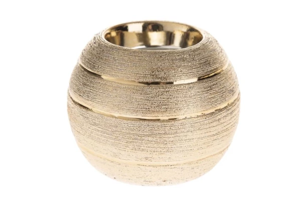 Keramický zaguľatený svietnik v zlatej farbe, pôsobí elegantne a upúta pozornosť v každej domácnosti. Priemer 8,5 cm.